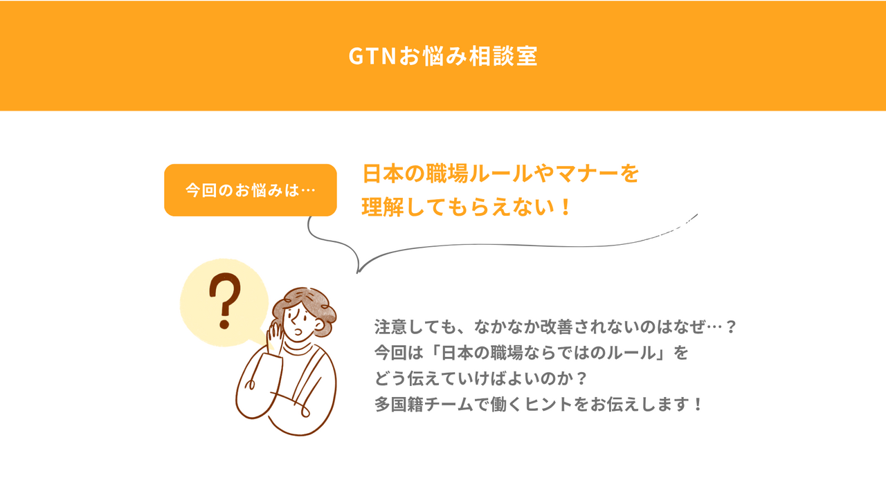 【GTNお悩み相談室 #2】外国人社員に「日本の職場ならではのルール」をどう伝える?多国籍チームで働くヒント