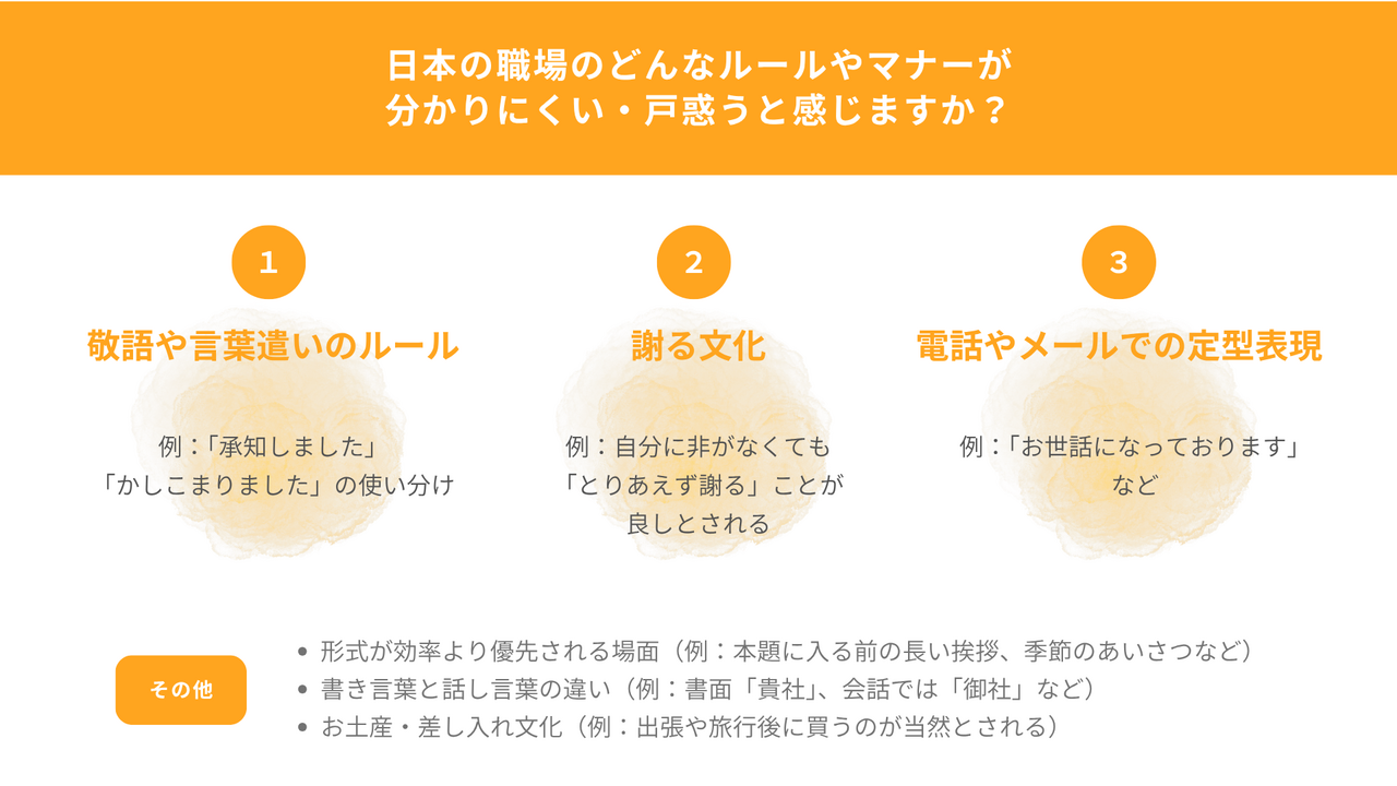 「日本の職場のどんなルールやマナーが「分かりにくい or 伝わりにくい/戸惑う」と感じますか?」という質問に対しては、下記のような意見が多く挙がりました👀
