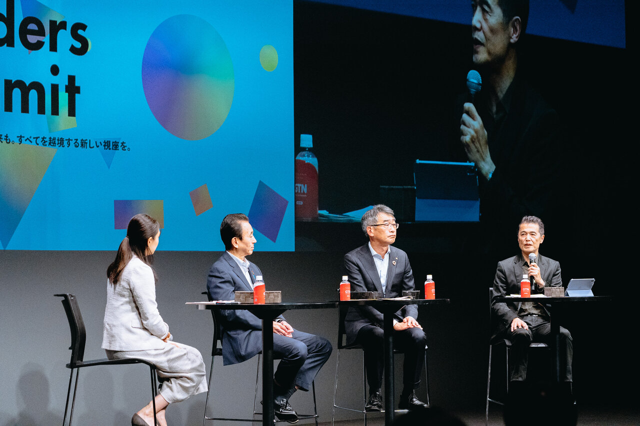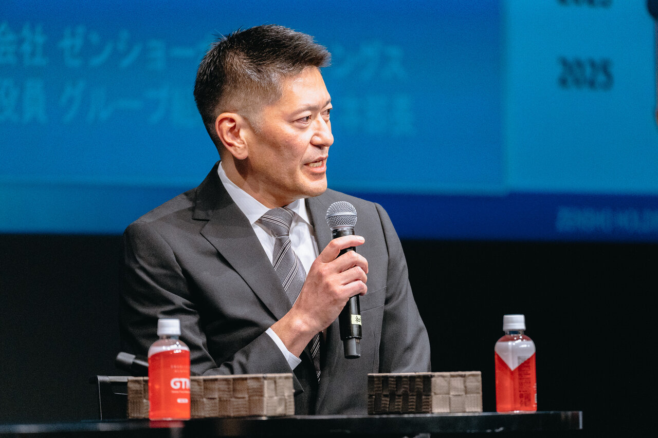 前半に引き続きモデレーターの谷本氏と永島氏がゲストとともにトークを展開。中央左が河合氏(セイノーホールディングス)、中央右は鈴木氏(ゼンショーホールディングス)。