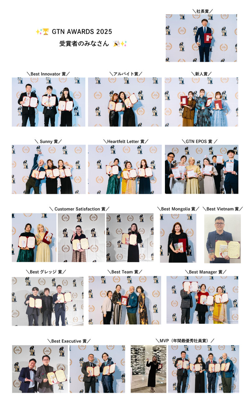 「GTN総選挙」とも呼ばれるこの企画では、社員投票を中心に16の賞が設けられ、年間の挑戦と成果が称えられました。韓国・ベトナム・モンゴルからの受賞者も登壇し、現地からの中継・プレゼンターも交えた臨場感ある表彰に。さらに、今年グループに加わった株式会社グレッジの皆さんからも初受賞者が登場し、「ファミリーの広がり」を体感できる時間となりました!