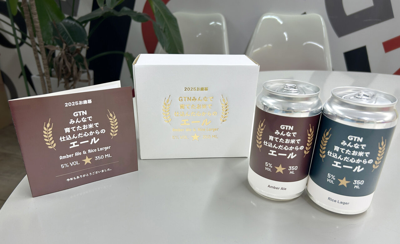 今年、GTNが選んだお歳暮は、社員が育てたお米で醸造する発泡酒でした。その名も「GTNみんなで育てたお米で仕込んだ心からのエール」です。