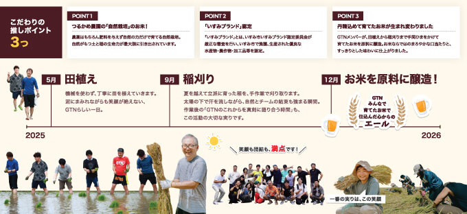 そこには、GTNがこの稲作づくりを通して、毎年考えてきた想いがあります。「一年間お世話になったお客さまへ、感謝をどう届けるか」。田植えから稲刈り、仕込みまで関わるプロセスを大切にしてきたのは、体験や物語そのものが、GTNの「一期一会」の精神や、人と人とのつながりを伝えると考えているからです。今年の「心からのエール」も、そうした積み重ねの中から生まれました。