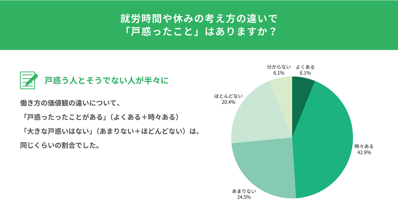 働き方の価値観の違いは、誰もが必ず困るものというよりも、感じ方や受け止め方に個人差があるテーマだと言えそうです。