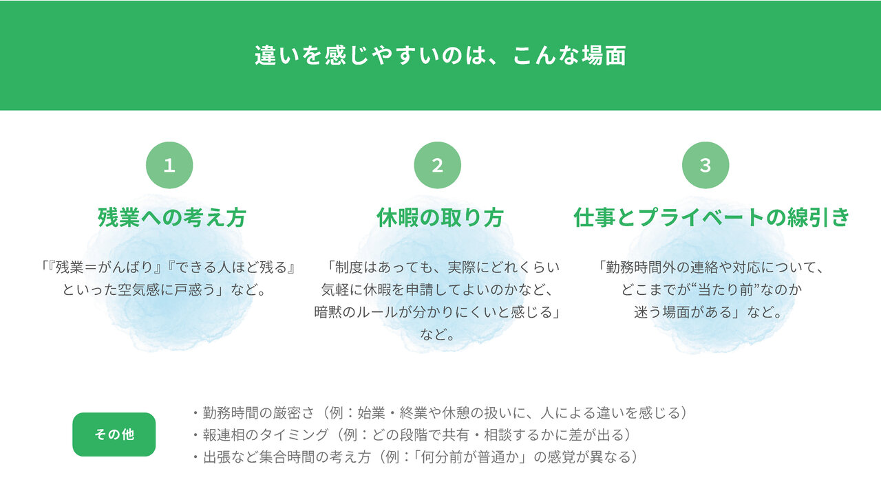 また、どんな場面で違いを感じたかを聞くと、残業への考え方や休暇の取り方、仕事とプライベートの線引きなど、日常の業務に直結するポイントが多く挙がりました。